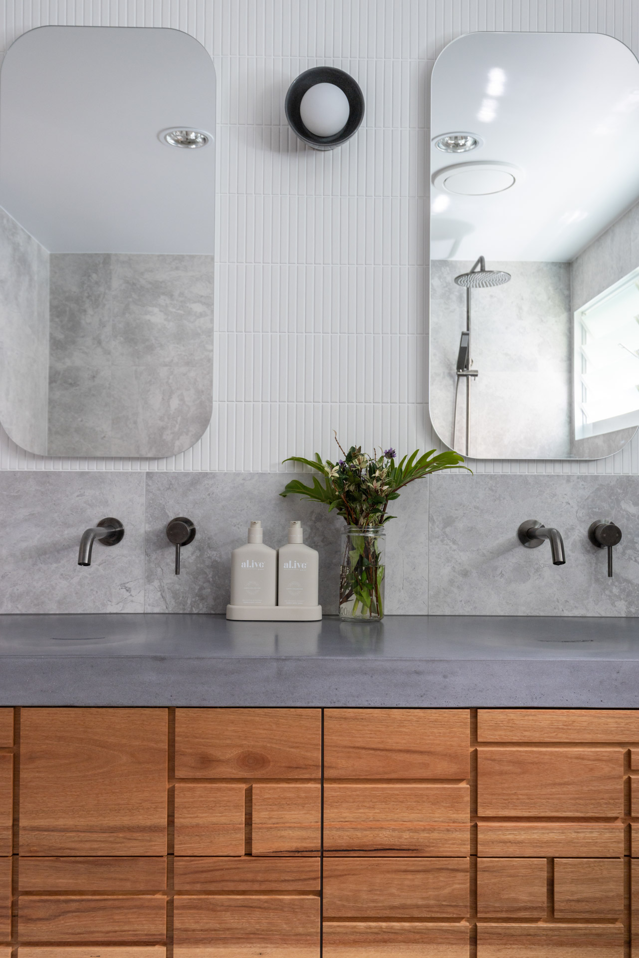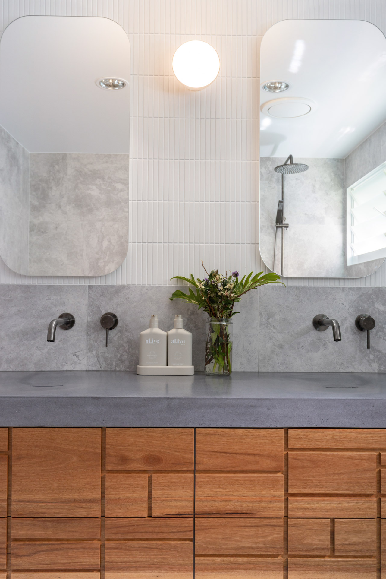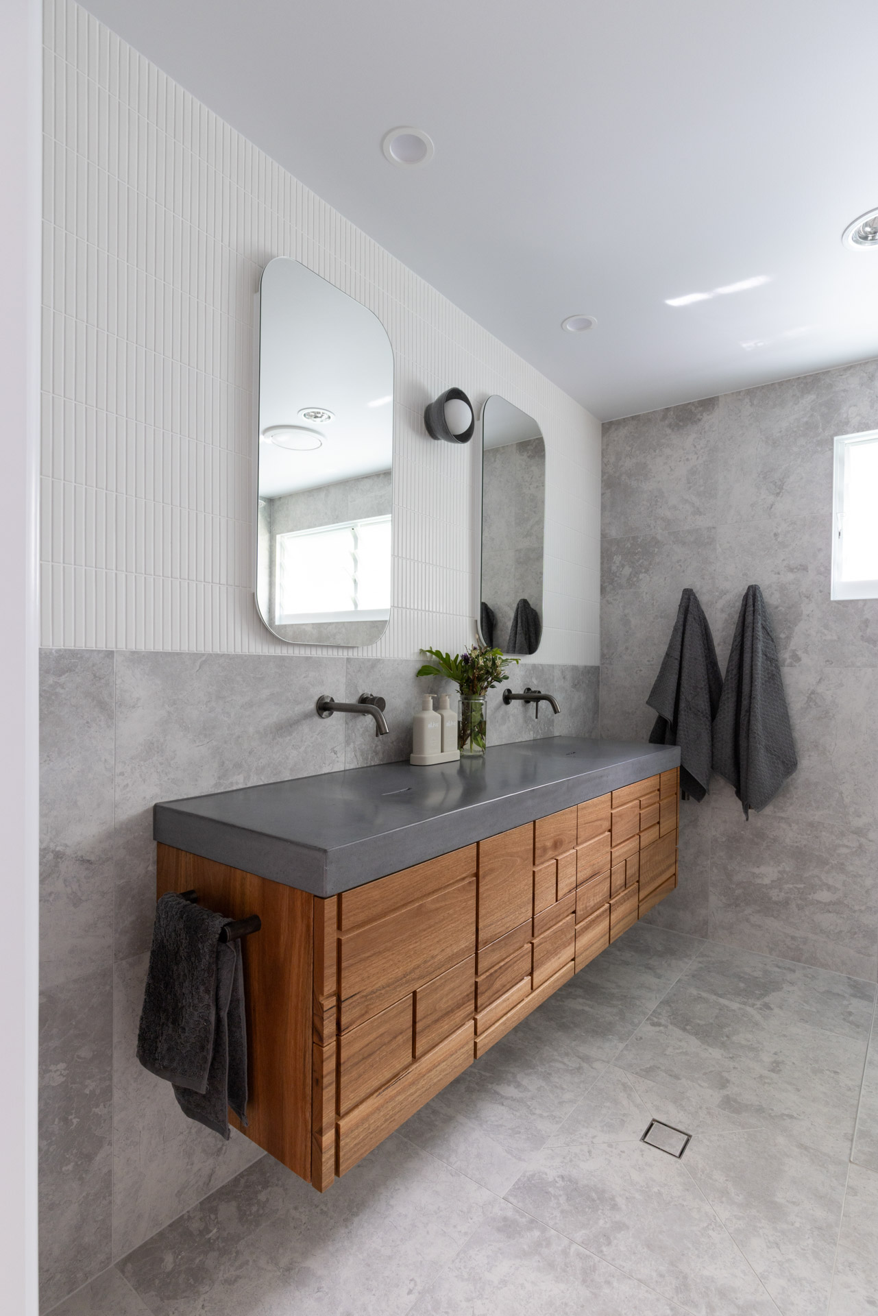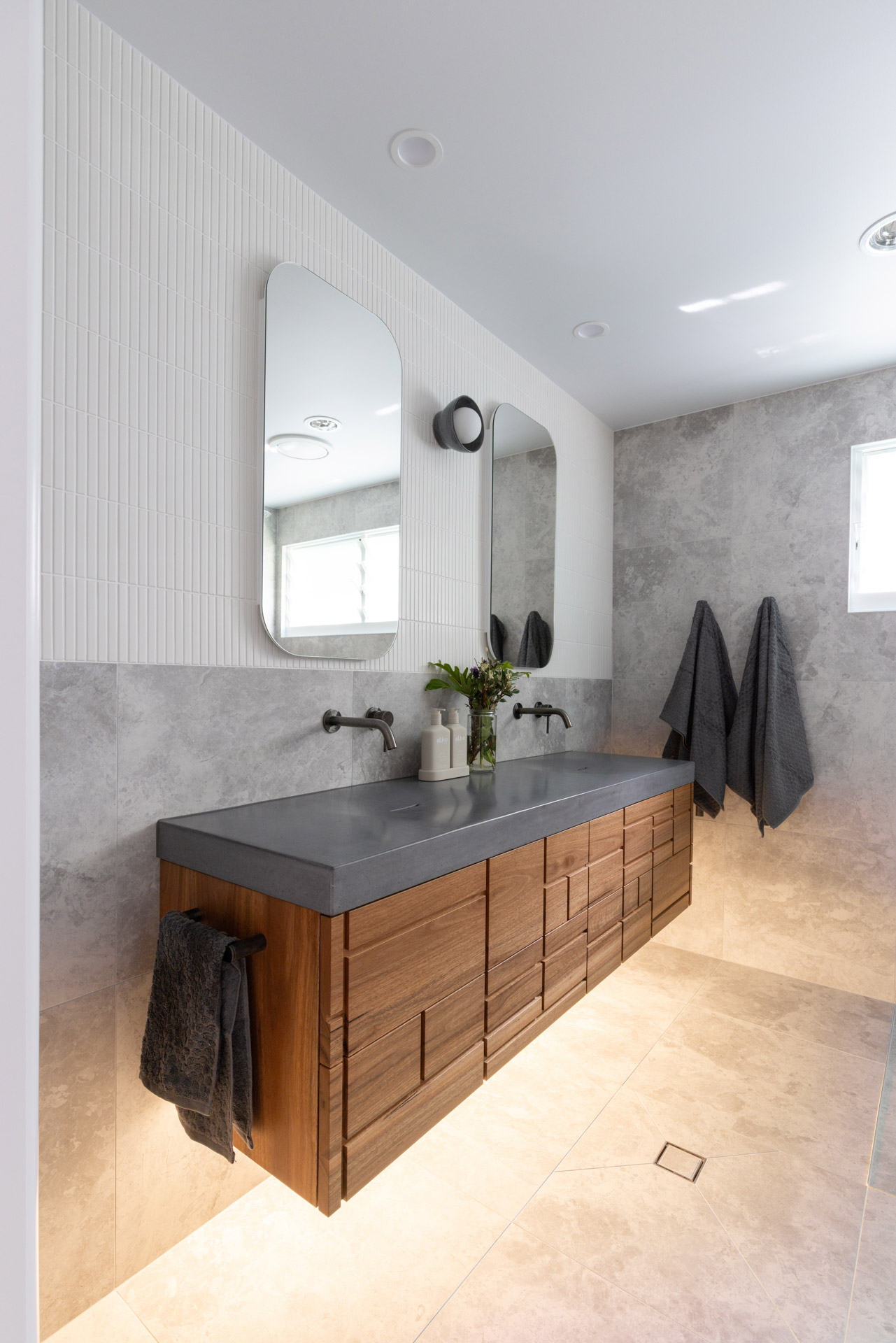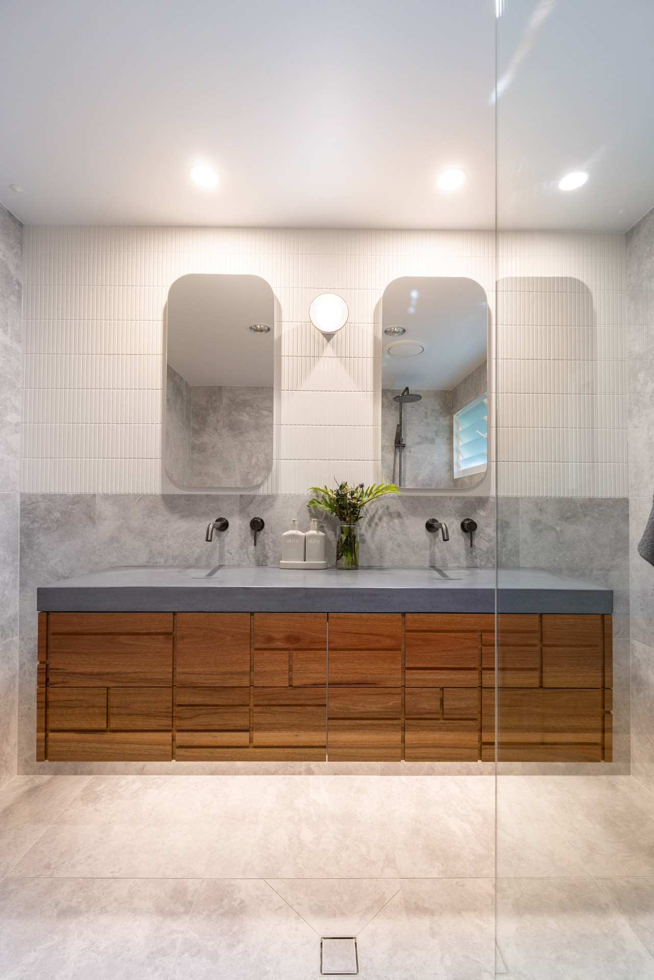 With a custom designed floating timber vanity, topped with a Mickey Mouse moulded concrete top, this space is a picture of modern elegance.