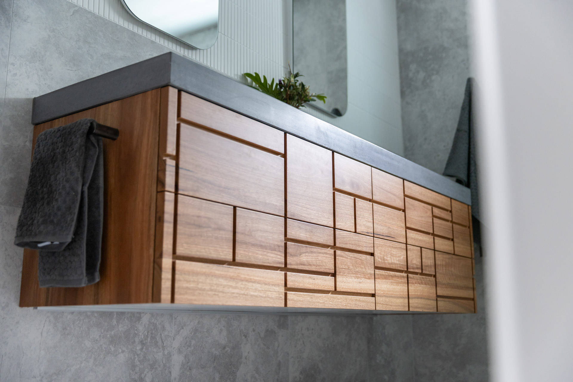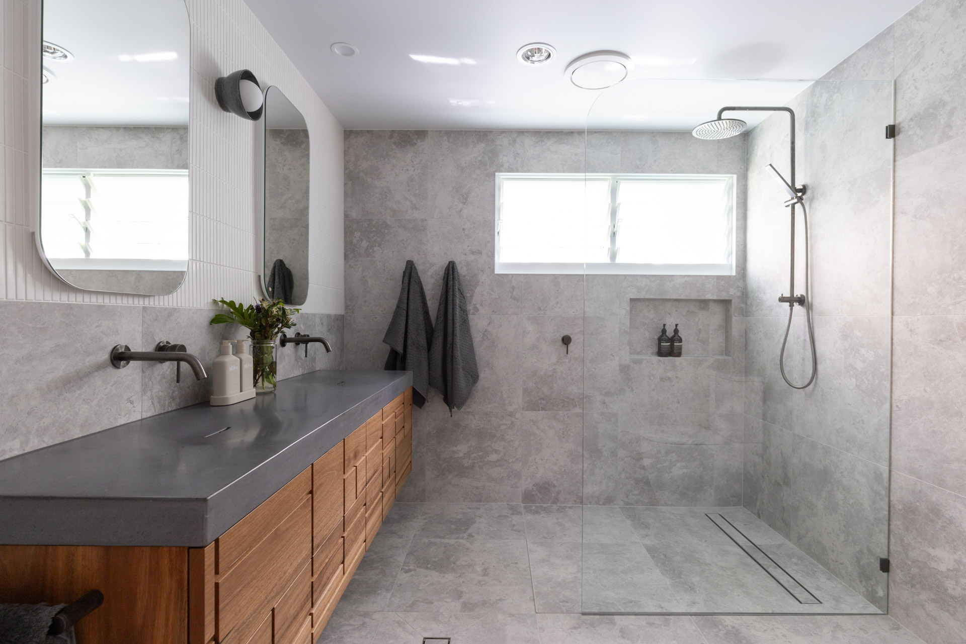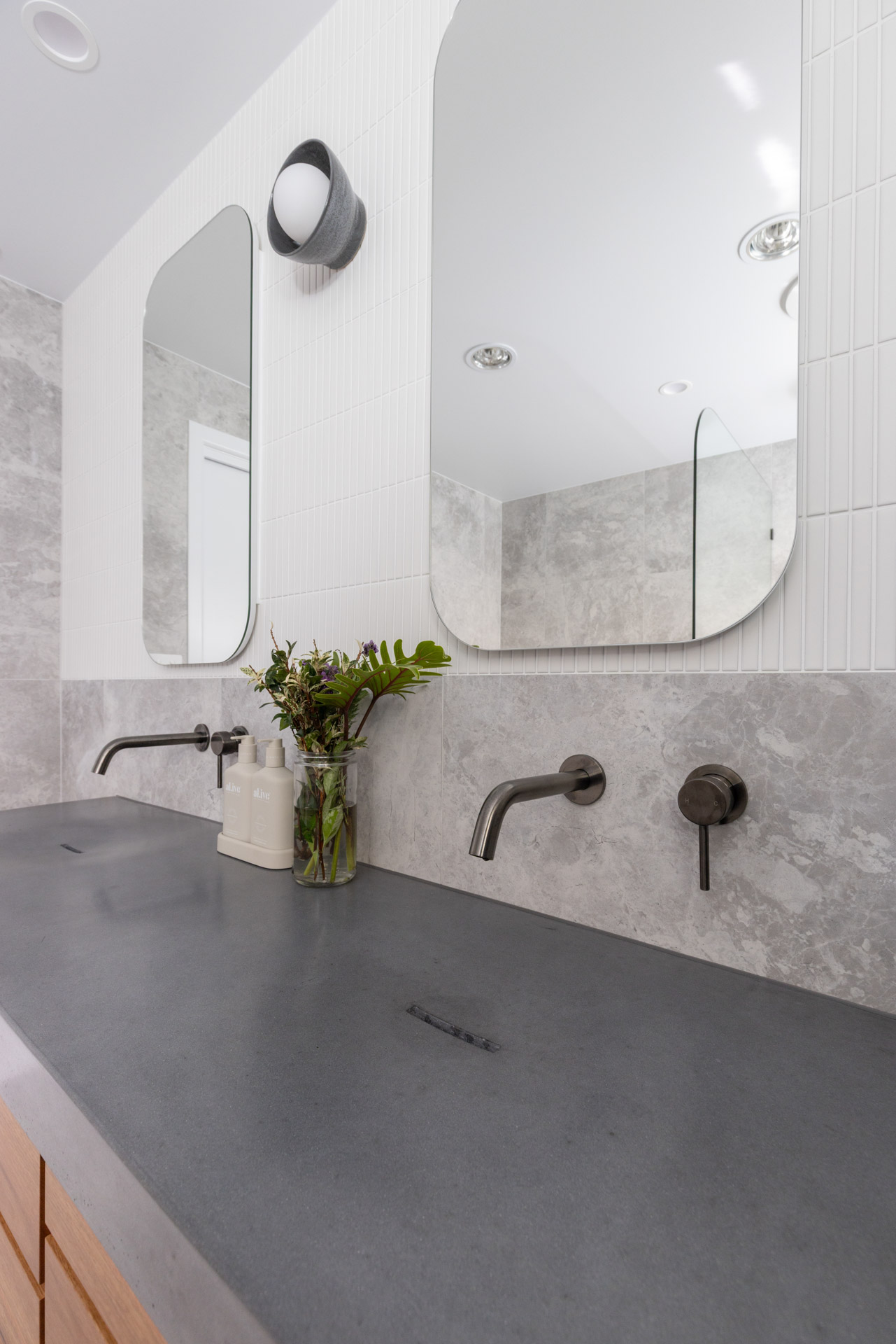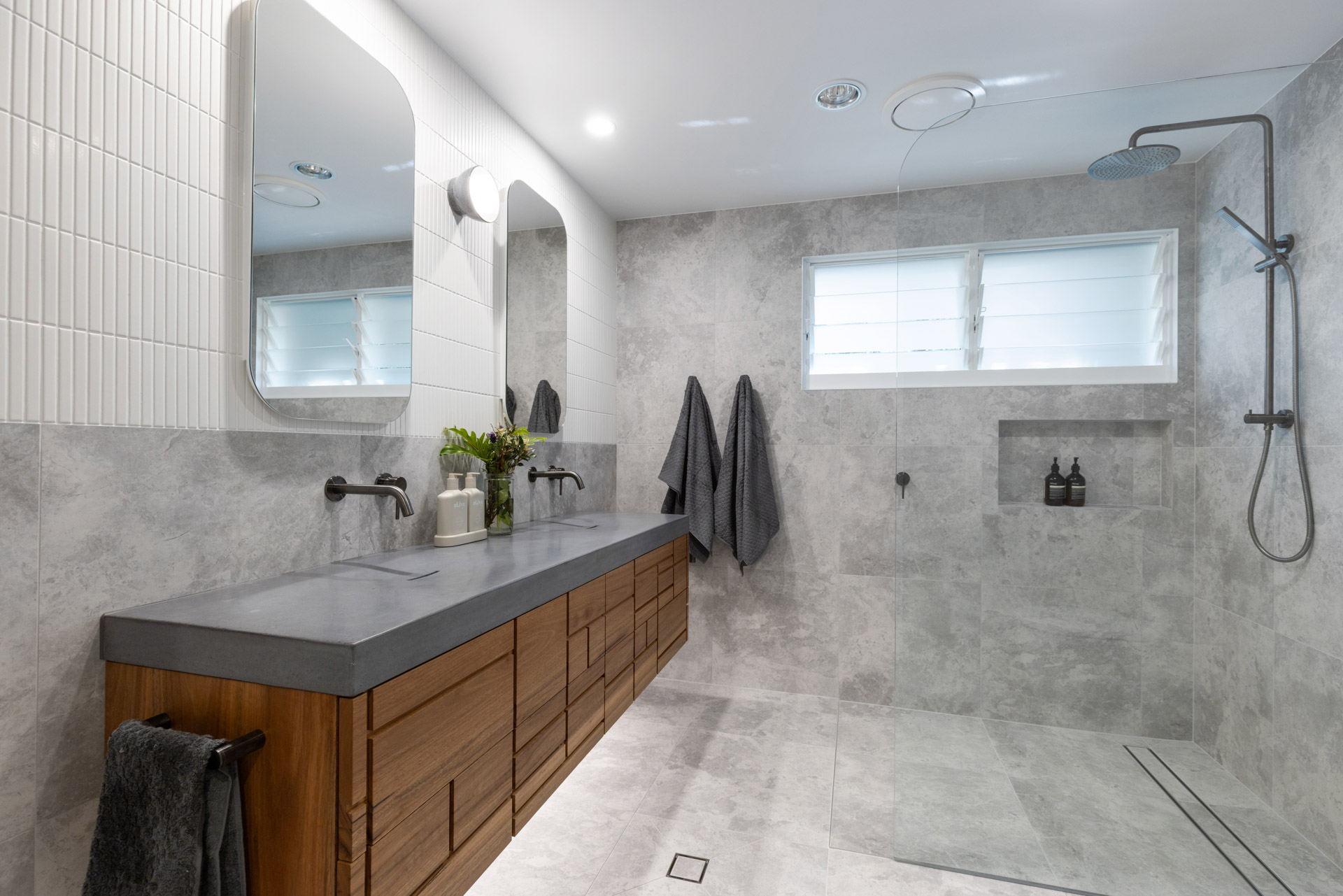 With a custom designed floating timber vanity, topped with a Mickey Mouse moulded concrete top, this space is a picture of modern elegance.
