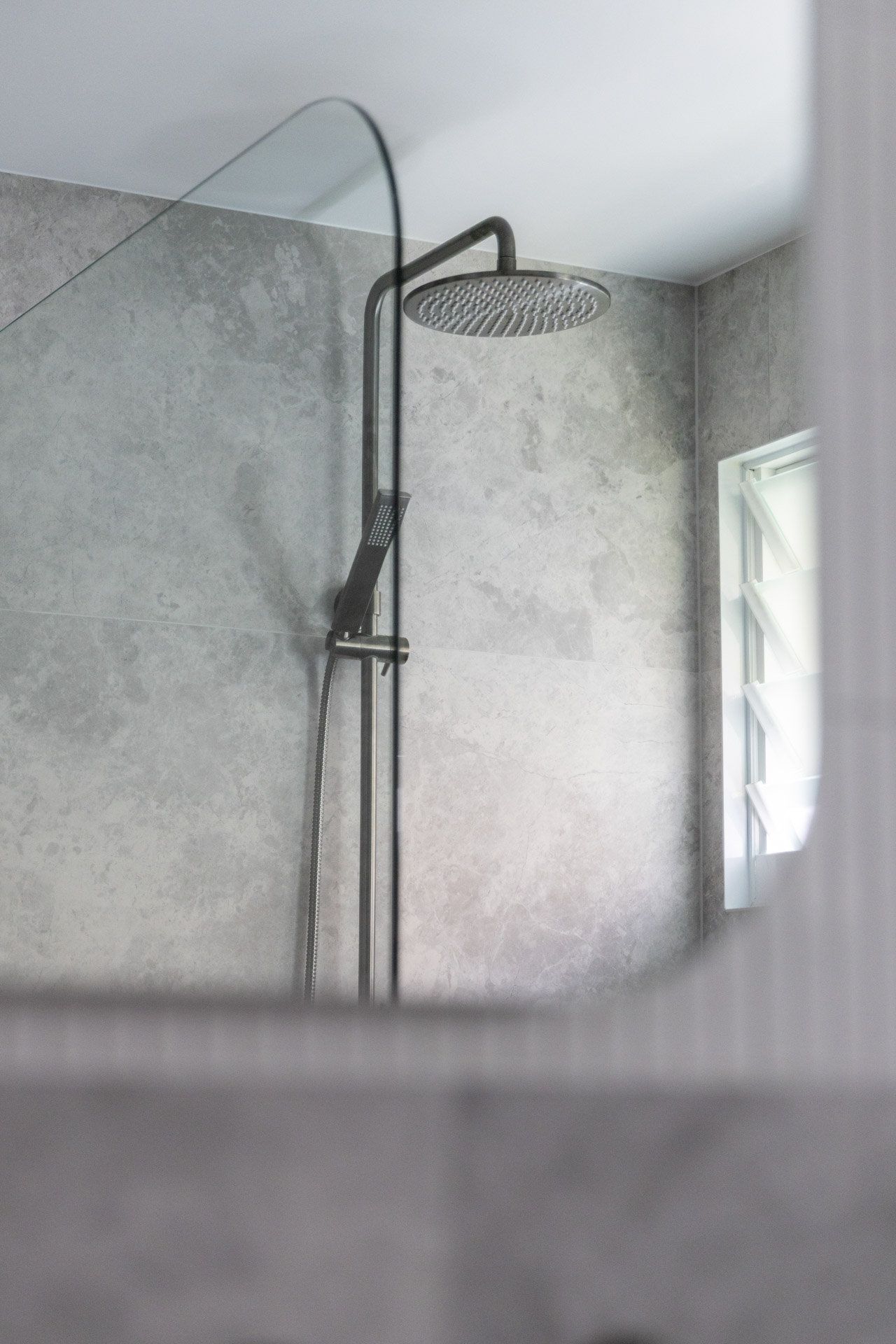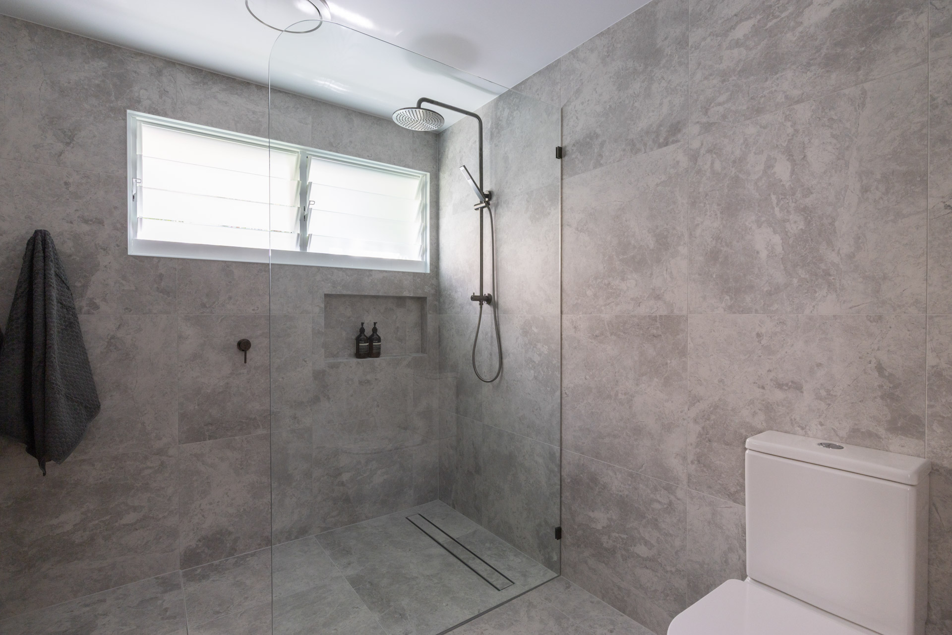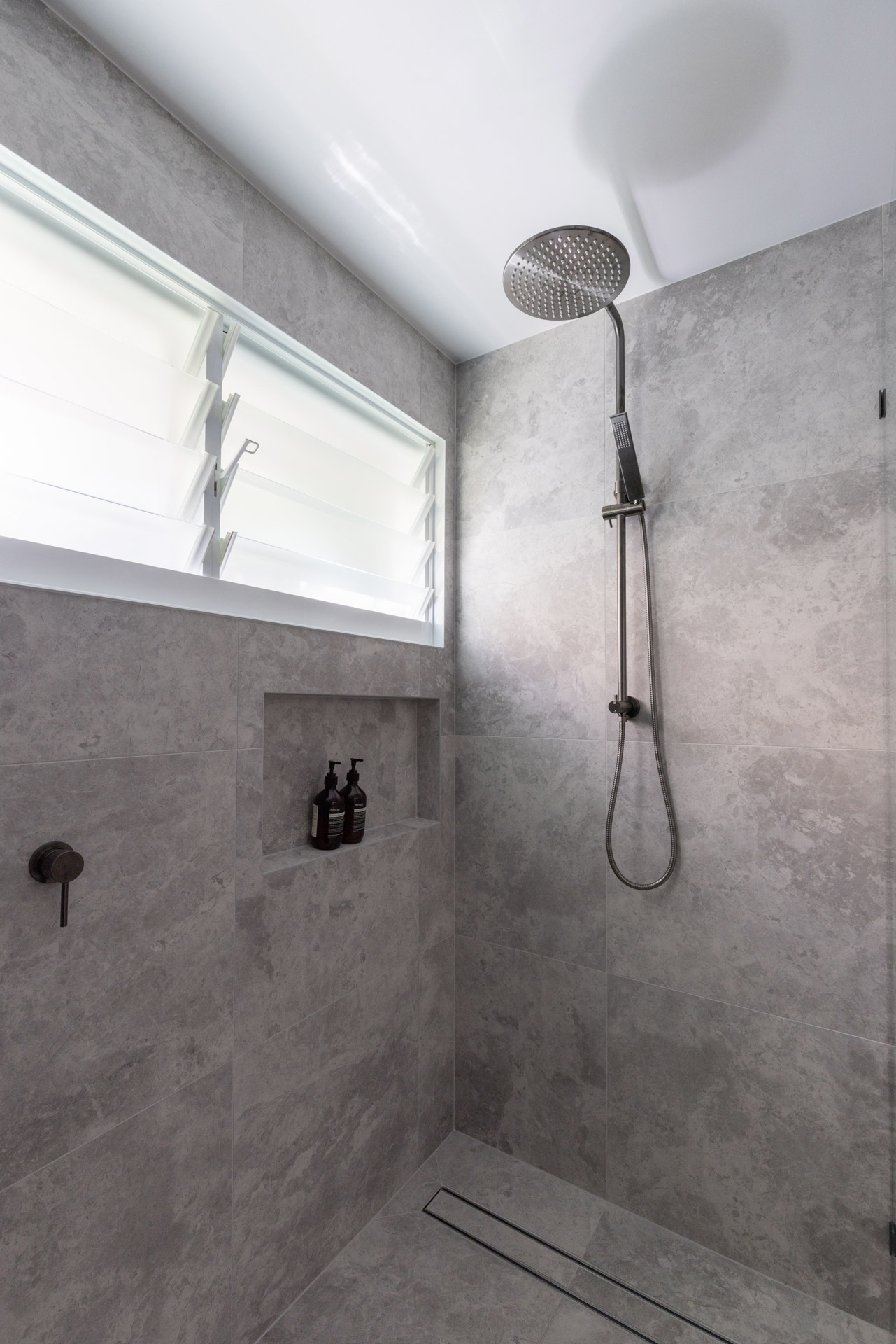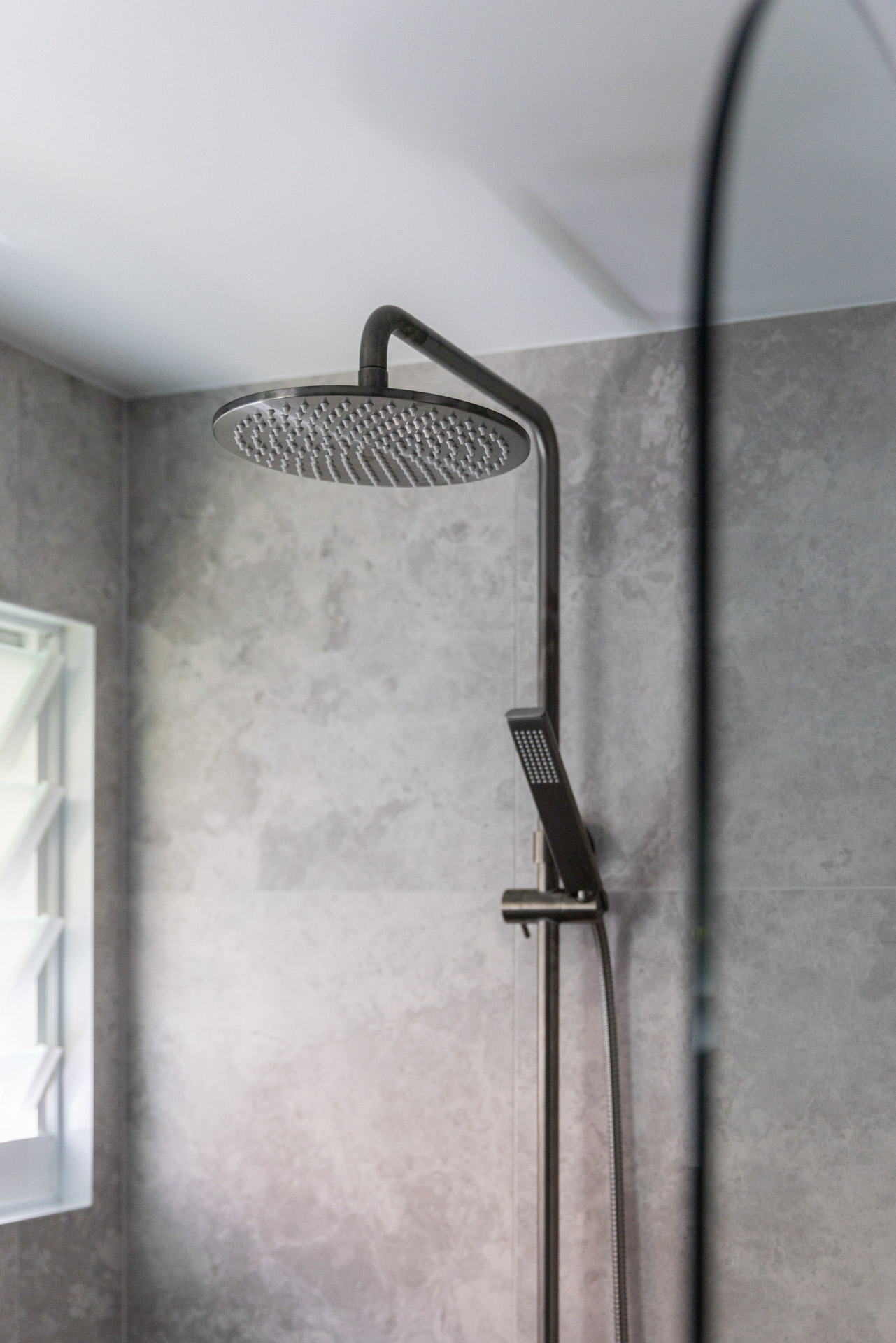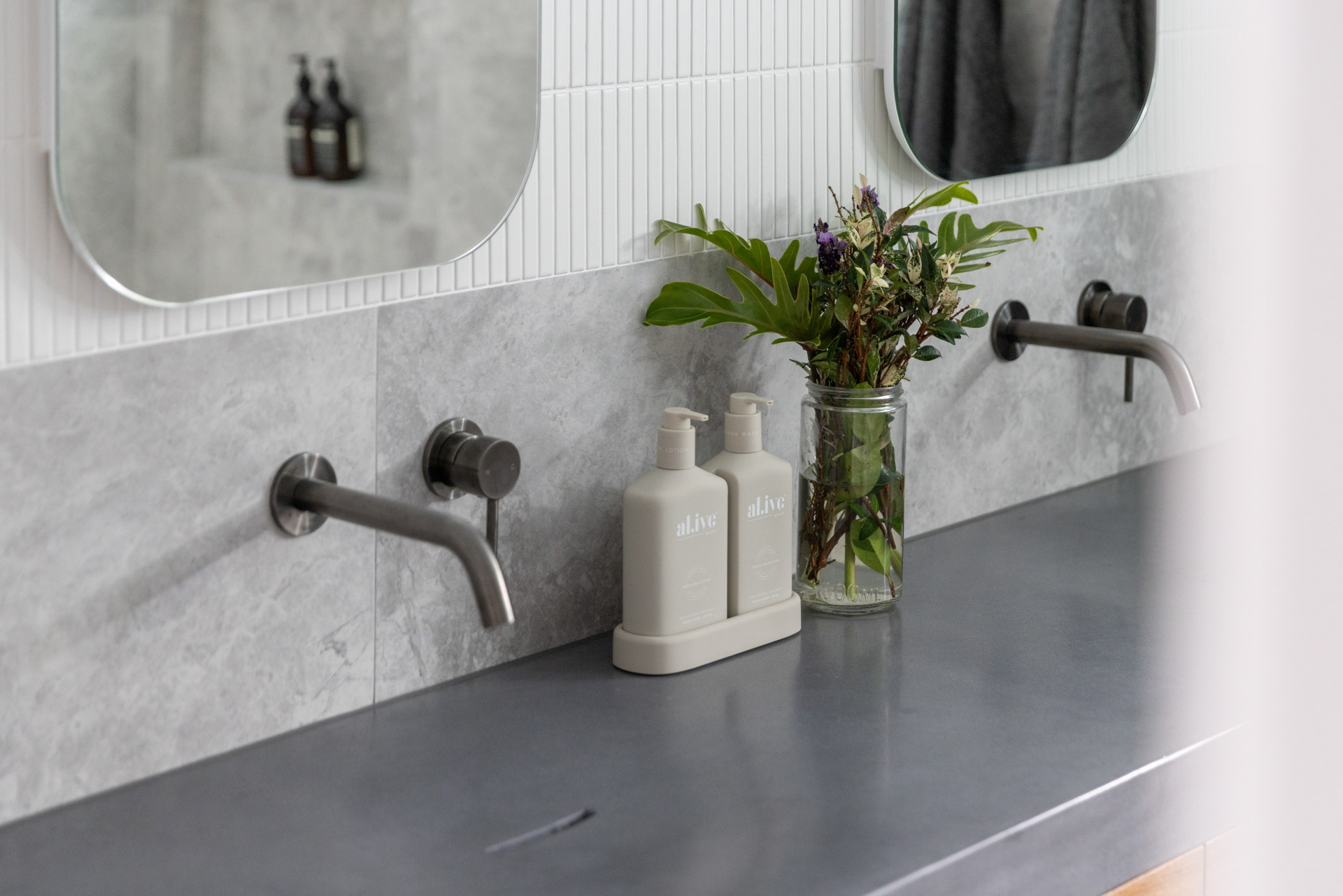 With a custom designed floating timber vanity, topped with a Mickey Mouse moulded concrete top, this space is a picture of modern elegance.