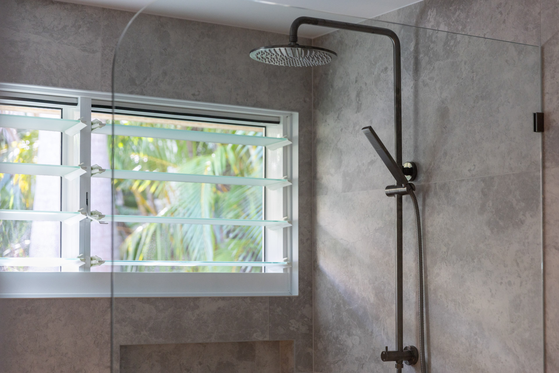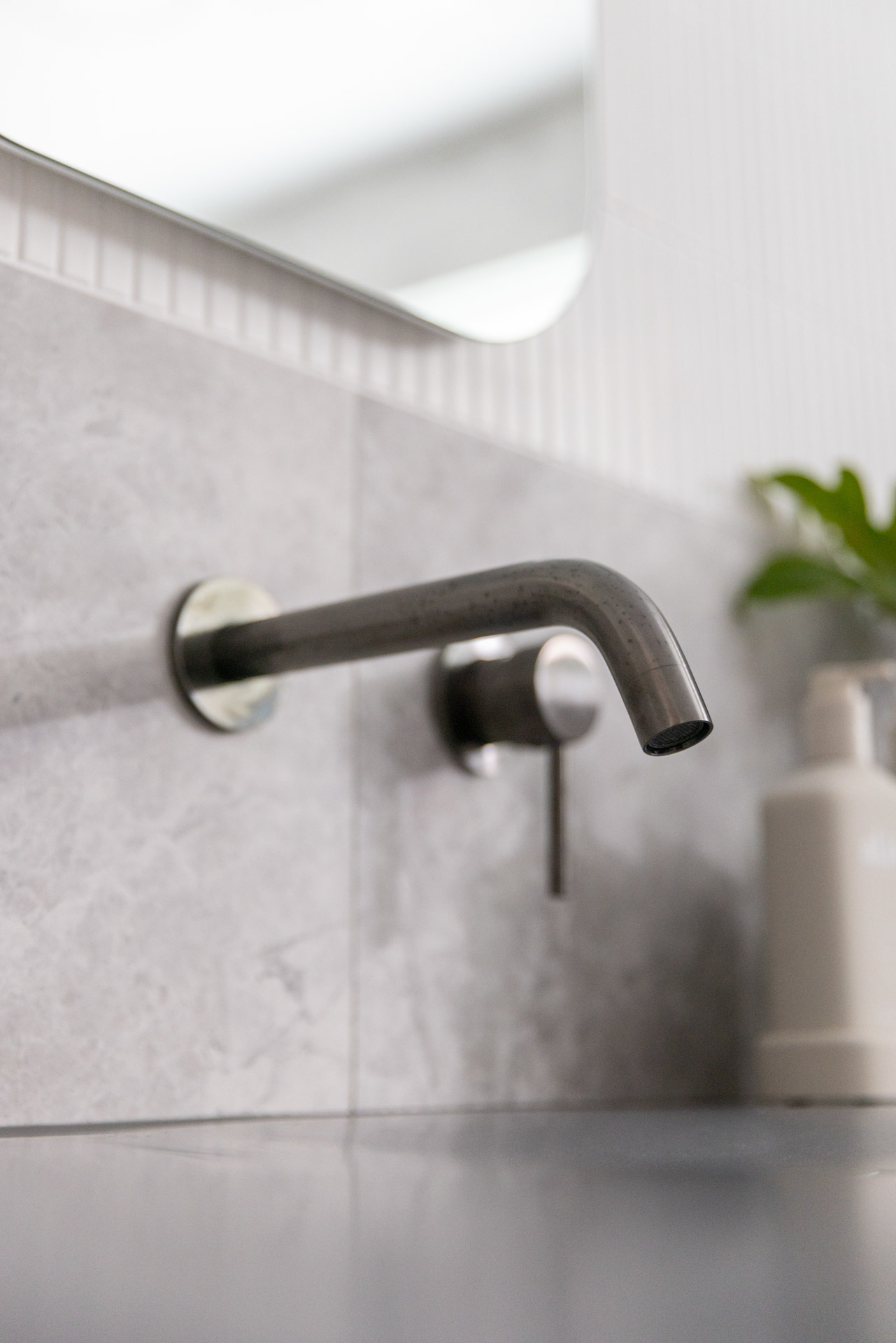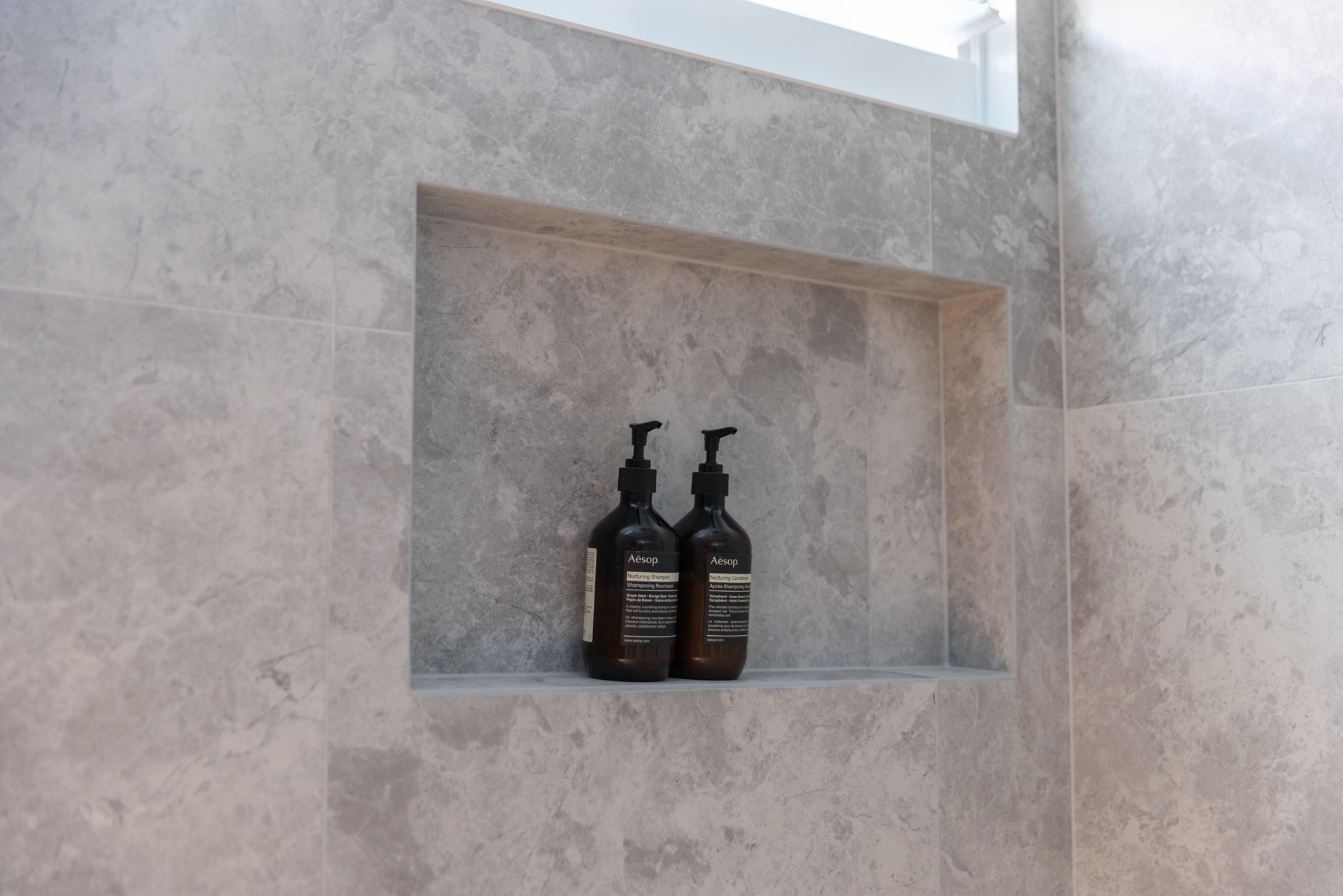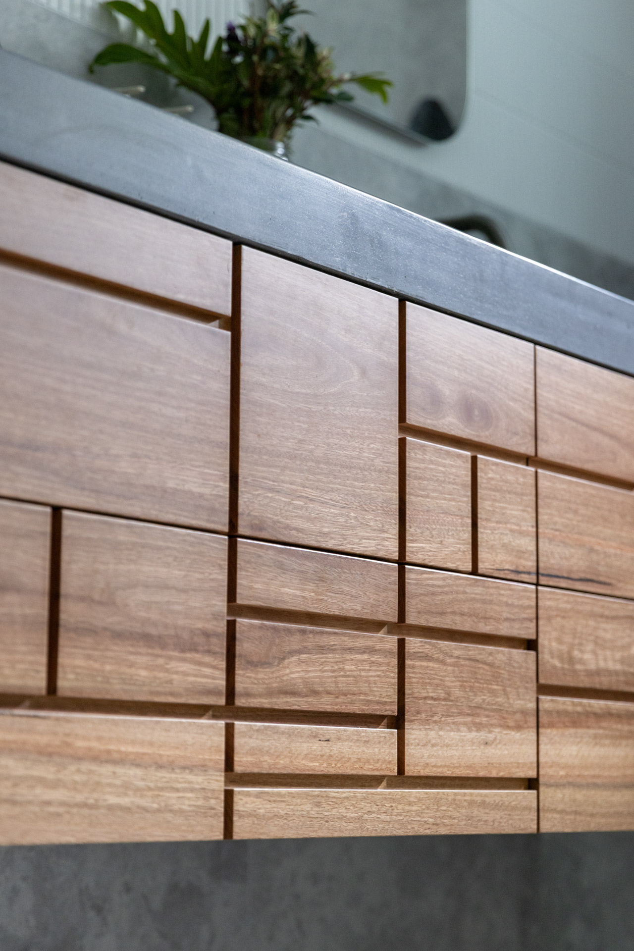 With a custom designed floating timber vanity, topped with a Mickey Mouse moulded concrete top, this space is a picture of modern elegance.