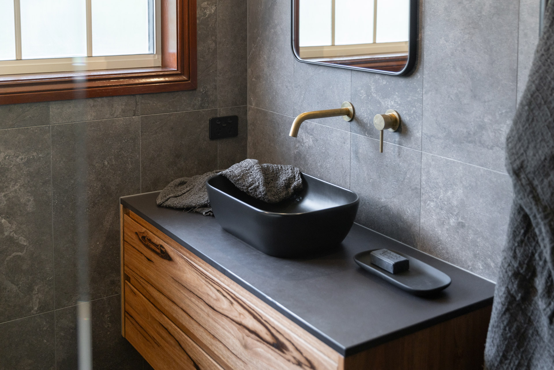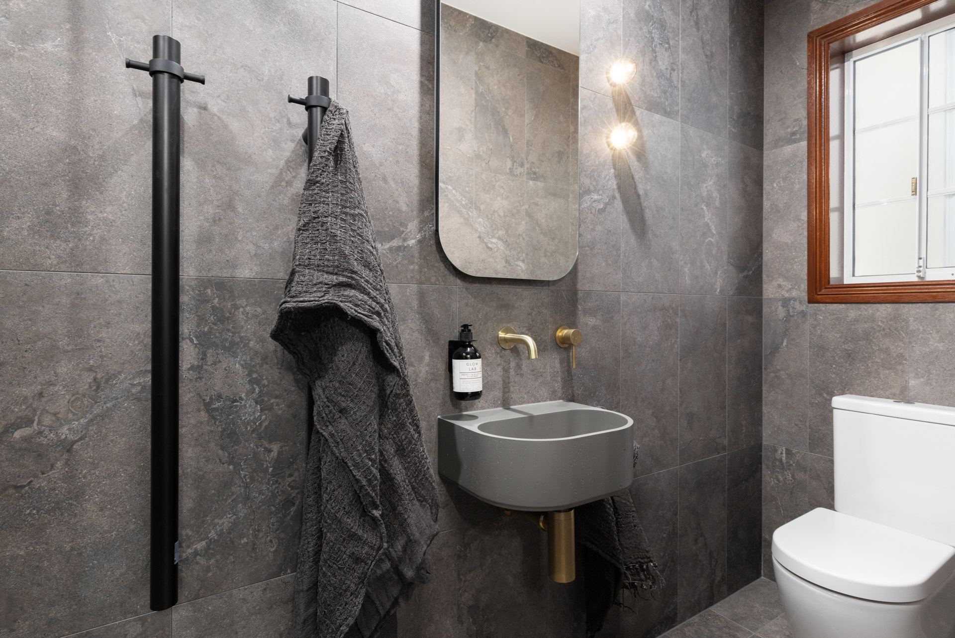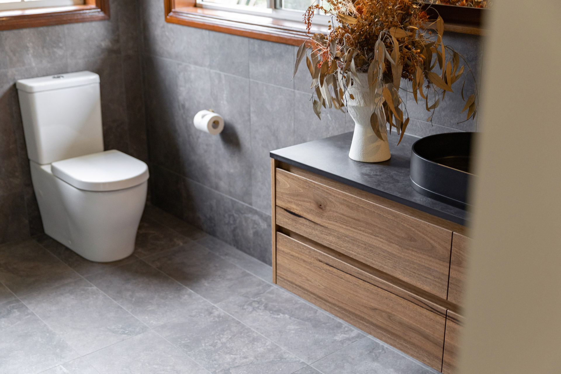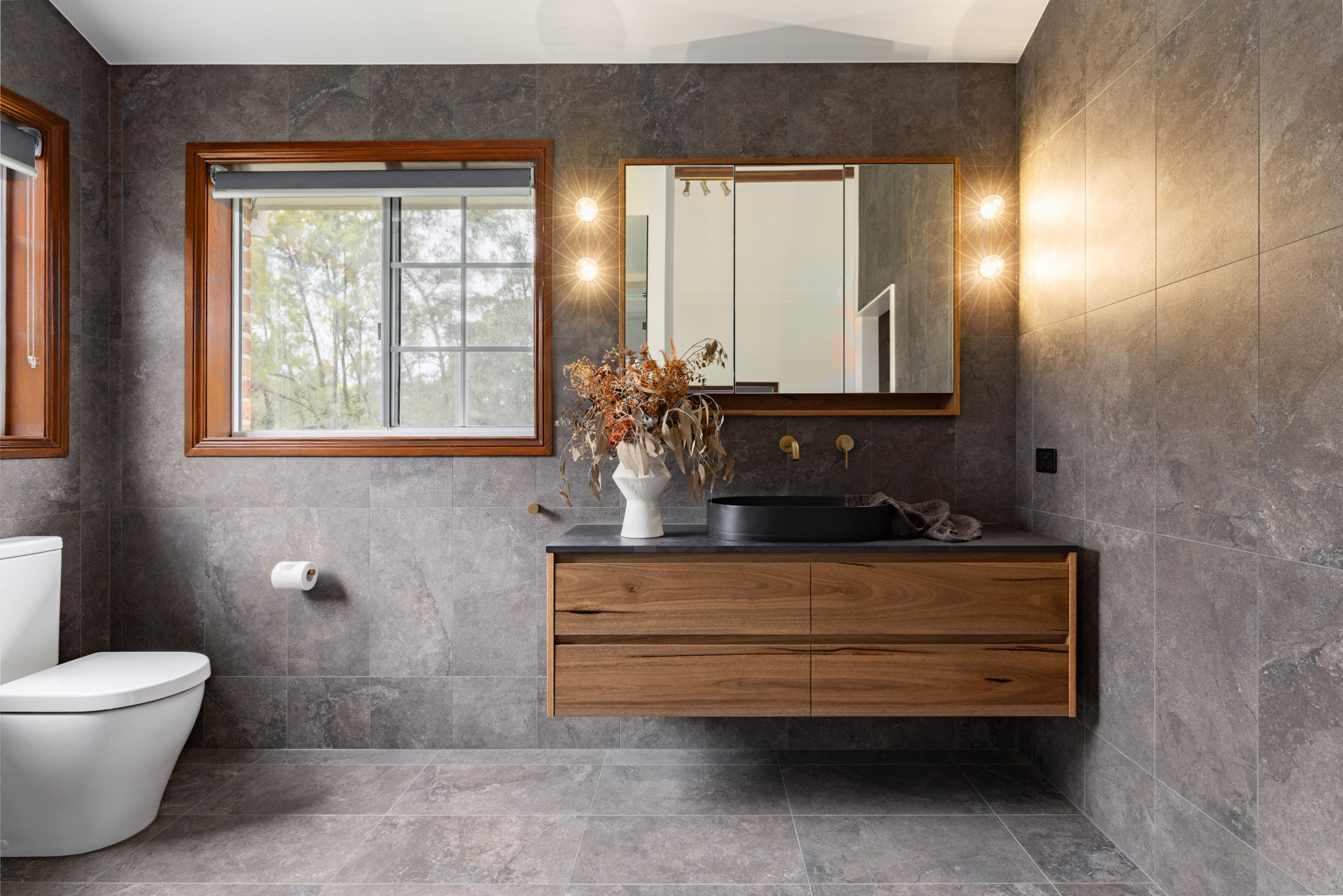 Three bathrooms and a toilet room all thoughtfully designed with timber tones, soft lighting and a splash of colour.